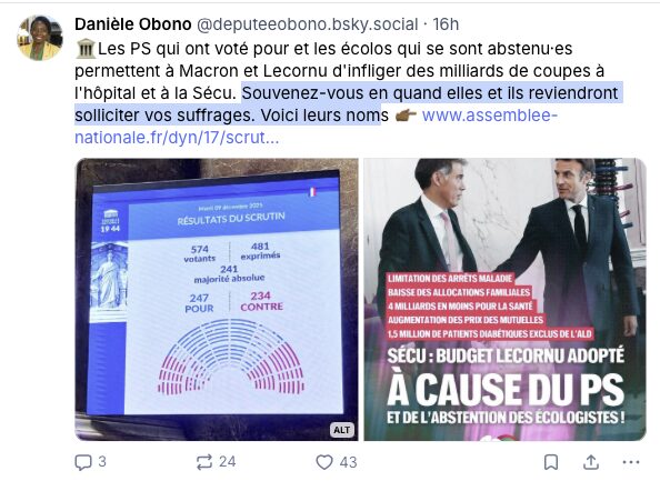 Hier il s’est passé un fait remarquable : presque tous les députés étaient présents pour voter le budget de la sécurité sociale , mais juste avant il y avait le vote de la partie dépenses et là ce sont 227 pour , 87 contre. On est loin de 575 députés : il en manquait 261 lors de ce vote. les vociférateurs de la LFI et du RN n’étaient pas tous présents dans l’hémicycle, étaient ils à la buvette ou alors dans les couloirs ? ils sont revenus plus tard pour le vote sur le texte complet. Vote où le groupe socialiste à 90% a voté pour ce budget.